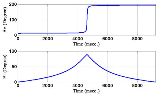 The coordinates of a satellite are usually expressed in terms of the elevation and azimuth angles. The aim is to determine the desirable angles in joint space for directing the antenna toward the satellite. The joint angles are entitled and . In fact, the satellite trajectory is expressed by the elevation and azimuth angles at any moment, as illustrated in Figure 1.