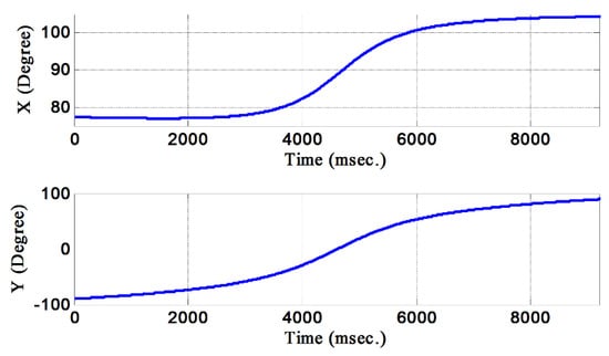 In (2), and are the input torques for and axes, respectively. According to (2), it is clear that the X-Y pedestal is a Multiple-Input Multiple-Output (MIMO) system, where the interference effect exists as well. For detailed information about the elements of the matrices in (2), see Appendix A and [2,7].