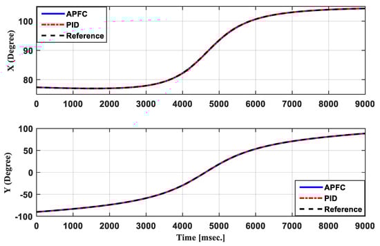 The reference input, the response of the closed–loop control system using APFC scheme and PID controller for X and Y axes.