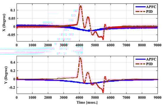 The control efforts of the APFC and PID controllers are illustrated in Figure 6. It is obvious that the ranges of the control efforts for APFC and PID controllers are significantly different. An interesting feature of APFC is its desirable performance against the interference effects of the two channels. This is due the consideration of these effects in the system identification at every moment, which affects the system model in the next moment. If the satellite trajectory approaches zero along the Y axis (this occurs when the satellite is located in horizon), maximum acceleration is achieved along the inferior axis of the pedestal. This case is the same as when passing a satellite over an El/Az pedestal (zenith pass). In other words, the singular point for the X-Y pedestal is zero degrees along the inferior axis, namely, the Y axis. Hence, the control effort generated by the PID controller is higher at the moment, corresponding to zero degrees. However, in comparison to the APFC, the tracking error for the PID controller is significantly larger. On the other hand, the interference effect for the and channels at these moments (corresponding to near zero degrees) is higher. Generally, the control effort generated by the PID controller is greater than that of the APFC, which may result in the saturation of actuators in the control system.