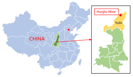 The experimental site considered in this study was the 21309 roadway of the Huojitu coal mine. The Huojitu coal mine is owned by the China Shenhua Shendong Coal Group Corporation Limited. It is located on the bank of the Ulan Mulun River at the southern end of Daliuta town in Shenmu County, Shaanxi Province, China. The annual production capacity of the Huojitu coal mine is 5 million tons, the minefield area is 63 km2, the geological reserves are 950 million tons, and the recoverable reserves are 624 million tons. Its location is presented in Figure 1.