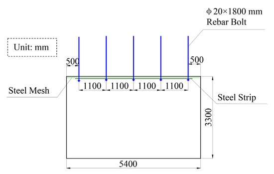 With regard to design dimensions, the 21309 roadway has a width of 5.4 m and a height of 3.3 m. Its cross section was designed to be rectangular, and the roadway lies along the coal seam floor. The average mining height of the 21308 working face is 3.7 m, and the length of the working face is 340 m. The design size of the coal pillar between working faces is 15 m. The previous support design for the roadway was based on the engineering analogy method; in other words, the support design of adjacent mines with similar geological conditions was adopted. The previous support design for the 21308 roadway is illustrated in Figure 3. The roof is supported by a rebar bolt, steel mesh, and steel strip. Five rebar bolts were arranged in each row, with a diameter of 20 mm, length of 1800 mm, spacing of 1100 mm, and row spacing of 1200 mm.