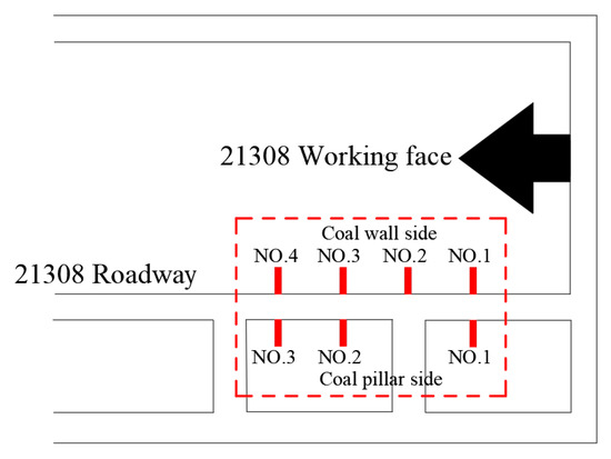 As the 21309 working face has not been mined, the 21308 roadway was selected as the location for broken rock zone detection. The 21308 and 21309 roadways are adjacent to each other, and their engineering geological conditions are almost identical. A total of four measuring stations, located 15, 25, 35, and 45 m away from the working face, were arranged. Each measuring station comprised two measuring holes located on the two sides of the roadway. The locations of these stations are shown in Figure 6.