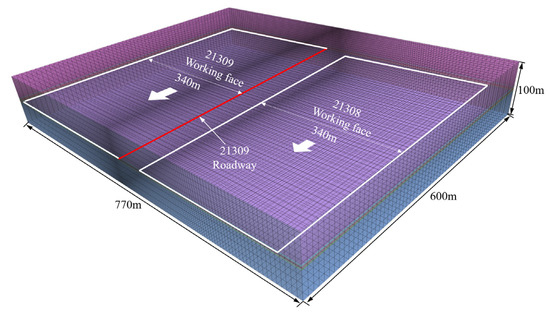 FLAC3D was used to simulate the distribution characteristics of the principal stress and the development of the plastic zone in the 21309 roadway, under the influences of the two mining operations at the 21308 and 21309 working faces. First, a numerical model was established. The dimensions of this model were 770 m along the X-axis, 600 m along the Y-axis, and 100 m along the Z-axis. The model is presented in Figure 7.
