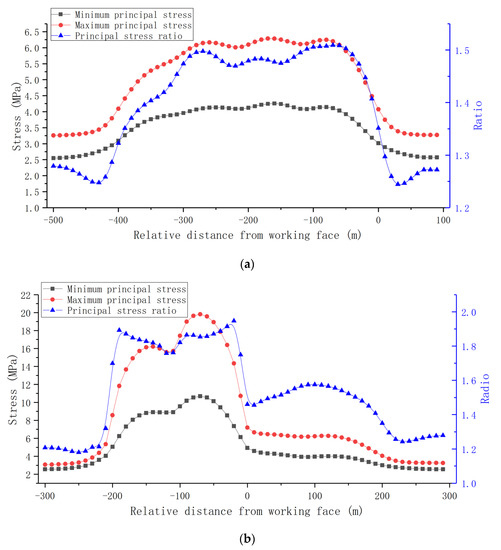 The value and ratio of the maximum principal stress and the minimum principal stress have an important influence on the stability of the surrounding rock of roadways. The maximum principal stress and the minimum principal stress in the surrounding rock of the 21309 roadway along the Y-axis were determined during mining in the 21308 and 21309 working faces; their distributions and ratios are presented in Figure 8. In this figure, the horizontal axis denotes the relative distance from the working face, and position “0” represents the position of the working face. The left Y-axis represents the principal stress value, and the right Y-axis represents the principal stress ratio.