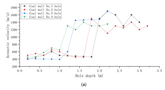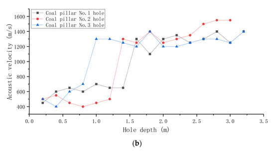 Acoustic propagation velocity of surrounding rock: (a) coal wall side hole; (b) coal pillar side hole.