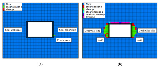 It is evident from the modeling results that, when the roadway is affected by primary mining, the development of the plastic zone in the surrounding rock is significantly limited. The surrounding rocks of the roof and floor are relatively complete, and only a small range of the plastic zone appears in the bottom corner of the coal pillar side. By contrast, the plastic zone in the surrounding rock is large when the roadway is affected by secondary mining. The plastic zone of the roof is small, the maximum depth is 0.3 m, the developmental range of the two sides is large, the maximum damage depth is 0.9 m, and the floor is relatively intact.