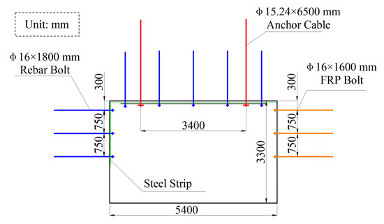 Each row of the roadway roof was supplemented with two anchor cables with a diameter of 15.24 mm, length of 6500 mm, spacing of 3400 mm, and row spacing of 2400 mm. The coal pillar side was supported with a rebar bolt and a steel strip. Each row included three bolts, with a diameter of 16 mm, length of 1800 mm, spacing of 750 mm, and row spacing of 1200 mm. Fiber-reinforced plastic bolts with a length of 1600 mm were used for the coal wall side; except for the length, the other support design was identical to those for the coal pillar side.