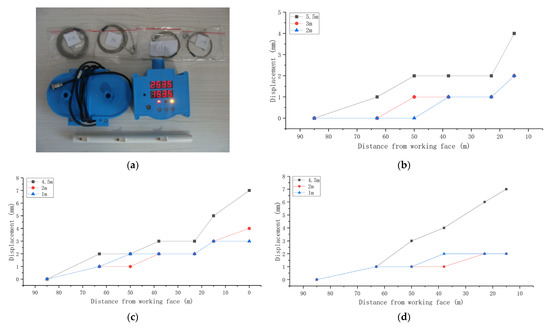 Surrounding rock deformation: (a) field-monitoring instrument; (b) deformation trend of roof; (c) deformation trend of coal wall side; (d) deformation trend of coal pillar side.
