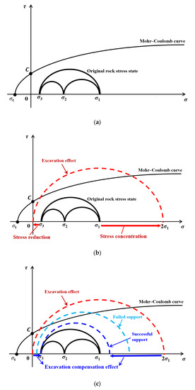 Mohr–Coulomb theory: (a) original rock stress state; (b) excavation effect; (c) excavation compensation effect.