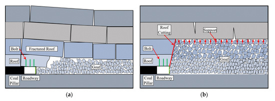Based on the broken rock zone detection for the surrounding rock, it can be concluded that the rock failure range on the coal wall side is greater than that on the coal pillar side. This is likely due to the fracture of the roof in the goaf behind the working face, whereby the pressure is transmitted to the two sides along the roof, as shown in Figure 15a. As the coal wall side is closer to the goaf, the transmitted stress is greater, and the damage is more severe. The coal pillar side is also damaged owing to the pressure exerted by the roof, which is clearly significantly dangerous. To reduce the damage to the roadway surrounding rock, the stress transmission path from the goaf to the roadway needs to be separated; one effective technology currently available is roof cutting and pressure relief, as shown in Figure 15b.