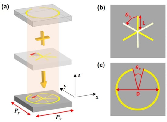 Figure 1a shows a representative unit cell of the proposed metamaterial numerically simulated in this study. The two top virtual layers have two different types of meta-atoms, a C-shaped metallic split-ring resonator (SRR) with spatially varying geometric parameters and a Y-shaped metallic rod with different rotation angles. The meta-molecule shown in the lowest layer of Figure 1a can be considered a unit cell of composite metamaterials, produced by combining the SRR and the Y-shaped rod.