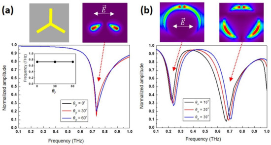 The basic components (C-shaped SRR and Y-shaped rod) display optimal characteristics for fabricating the composite metamaterials, which can also be called meta-rotamers. The Y-shaped meta-atom is one of the simplest structures showing polarization-insensitive transmission or absorption properties because of its higher-order rotational symmetry and folded-slot resonators; moreover, it is available to fabricate multimode resonators and active control devices [28,29,30,31,32,33]. As shown in Figure 2a, the folded planar resonator consisting of two arms placed in the direction of polarization of the incident THz waves generates a dipole resonance with a resonant wavelength equal to twice the length of the metal rod [31]. When the Y-shaped meta-atom rotates, the three arms alternately assume the function of the folded planar resonator while exhibiting polarization-independent optical properties, as shown in the inset of Figure 2a. Here, the normalization was carried out by dividing the spectral amplitudes through the metamaterials by the spectral amplitude through bare silicon used as a substrate.