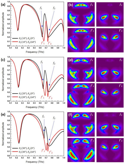 Figure 3a demonstrates the simulated amplitude spectra of THz wave transmission for the meta-rotamer displayed in Figure 1a. For the two transition states of the meta-rotamers with different angles of rotation of θy = 0° and 60°, the transmission spectra clearly present two resonant dips corresponding to the frequencies of f1 and f2 at θy = 0° and f’1 and f’2 at θy = 60°. f1 and f’1 represent the second-order LC resonance of the C-shaped SRR, whereas f2 and f’2 represent the electric-dipole resonance of the Y-shaped rod.