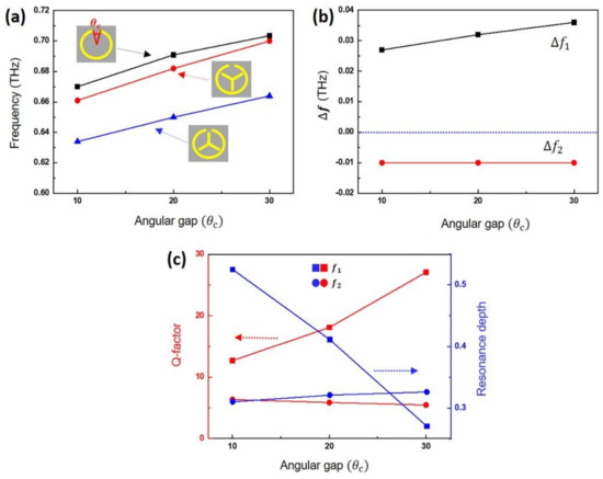 The coupling strength is important in achieving resonance characteristics such as a high Q-factor. As shown in Figure 4c, the Q-factor exhibits an interesting growth behavior with the increase of the angular gap showing higher coupling strength between the two resonances. Here, if the coupling strength is increased by approximating the two resonances in the spectrum, a larger Q-factor can be expected. Although we expected to maximize the Q-factor and the resonance strength, there was a tradeoff between these factors, which is a typical characteristic of the resonance phenomenon, as shown in the values of resonance depth (blue squares). On the contrary, the Q-factor and resonance depth extracted from the dipole resonance of the Y-shaped rods exhibited a slight difference by varying the angular gap. Thus, the asymmetric feature of the Fano-like resonance caused by the strong coupling between each resonance of two different types of meta-atoms suggests a method to control the resonant frequency and the Q-factor.