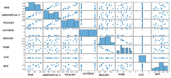 The aim of collecting primary data for this study was to develop a BFP prediction model capable of predicting BFP with high accuracy rates using the relevant anthropometric attributes and determine the most significant parameters that affect the prediction model. The dataset consisted of eight attributes (gender, age, height, weight, abdominal C, WHR (the ratio of waist circumference/hip circumference), BMI (weight/height2), and BFP). The BFP was estimated by a body composition analysis device named BIA ACCUNIQ BC380 positioned in the Department of Food and Nutrition of Baxshin Hospital, Iraq, under the supervision of specialized doctors. The abdominal C in this study represented the waist circumference which is a “constant measure of abdominal obesity” [20]. Data were collected under the supervision of expert staff, and special procedures were followed to estimate the metric parameters as well as the body composition of 2000 observations of 387 males and 1613 females. The ages were between 18 and 29—the parameters were selected according to the importance of anthropometric models in historical research on BFP estimation.