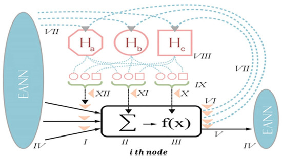 After numerous cycles, the model’s coefficients are attuned to patterns in the input and output and are then adjusted during the training process. Numerical coefficients of the hormonal factors influence the individual node elements, such as weight, activation, and summation function. The solid and dotted lines in Figure 3 represent the neural and hormonal lines. The output of ith neuron of an EANN with three hormonal glands was described as shown in Equation (2) [16]: