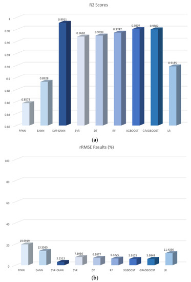 Visualization of the results obtained in this study, (a) R2 scores, and (b) rRMSE results.