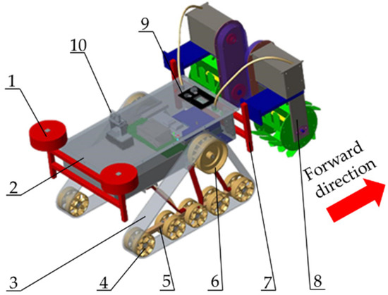 Paddy field self-propelled inter row weeder: (1) connecting rod, (2) frame, (3) crawler, (4) supporting wheel, (5) Suspension Frame, (6) driving wheel, (7) rear connecting frame, (8) inter row weeding device, (9) electric control equipment, (10) visual recognition system.