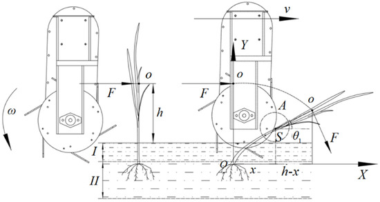 From the analysis of Equation (12), the elastic modulus E and section moment of inertia I are basically constant for a certain weed type. The common weeds in paddy field are barnyardgrass, arrowhead and sargassum, of which barnyardgrass is the most abundant and harmful [18]. In addition, the value of Elastic Modulus E and section moment of Inertia I of barnyardgrass are the largest in weeds, so the physical characteristics of barnyardgrass are mainly considered. When barnyardgrass was removed by burying, other weeds also be removed. When the depth of the weeding wheels in the soil is fixed, the height of the stress point h is constant, and the bending angle of the weeds decreases with increasing force F. Therefore, the greater the force is, the better the weeding effect is. When the force F of the structure on a weed remains unchanged, the bending angle of the weed increases with increasing height h of the stress point. Consequently, the higher the height of the stress point is, the less effective the weeding is.