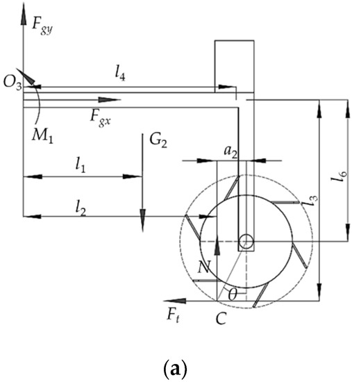where is the soil friction force on the weeding wheel, N; is the plumb distance from the rotation center to the soil force point, m; is the horizontal distance from the rotation center to the soil force point, m; and is the driving torque, N·m.