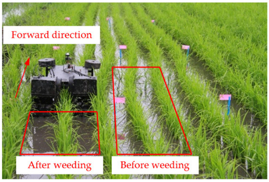 To test the working performance of the self-propelled inter row weeding device in a paddy field, weeding was performed on the self-propelled power platform for a field experiment in the experimental field of rice at Northeast Agricultural University on May 12, 2020, as shown in Figure 7. The experiment was carried out 14 days after transplanting. The rice variety was Longyang 16. The average height of the rice seedlings was 162 mm. No weeding was performed after transplanting. The weeds in the paddy field were mainly barnyardgrass. The average height of the barnyardgrass was 108 mm. The depth of the water layer and the depth of the mud layer were 35 mm and 155 mm, respectively. The average density of the inter row weeds was 52 plants/m2. The workers were skilled, and the machine was in good condition.