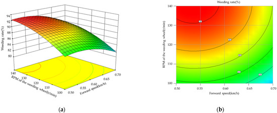Influence of the forward speed and rotating speed of the weeding wheels on inter row weeding rate: (a) response surface; (b) contour map.