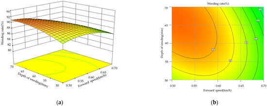 Influence of the forward speed and weeding depth on the inter row weeding rate: (a) response surface; (b) contour map.