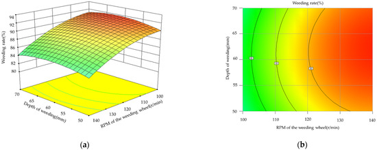 The response surface and contour map of the influence of the rotating speed weeding wheels and weeding depth on the inter row weeding rate are shown in Figure 10. When the rotating speed of the weeding wheels was constant, the inter row weeding rate first slowly increased and then slowly decreased with increasing weeding depth. When the weeding depth was constant, the inter row weeding rate increased with the increase in the rotating speed of the weeding wheels. The response surface changed quickly along the direction of the rotating speed of the weeding wheels and relatively slowly along the direction of the weeding depth, which indicated that the influence of the rotation speed of the weeding wheels on the inter row weeding rate was more significant than that of the weeding depth on the inter row weeding rate.