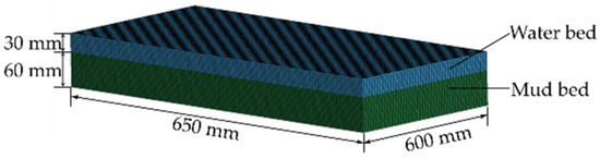 The water layer model and soil model were established by LS-Prepost of LS-DYNA. The water model is directly built on the soil model. The node coincidence command is used to overlap the nodes of the two cuboid models to form the coupling model of water and soil. According to the agronomic requirements, the size of the model of the water layer was set at 650 × 300 × 30 mm, and the size of the soil model was set at 650 × 300 × 60 mm. MAT_NULL in LS-DYNA was selected as the water layer material. The density was 0.001 g/mm3, and the cutoff pressure was −1 × 10−5 MPa [30]. The EOS equation of state was defined to determine the material parameters of soil and air. MAT_FHWA_SOIL in LS-DYNA was selected as the soil layer material. The main parameters were as follows: the soil density was 0.00161 g/mm3, soil particle density was 0.00273 g/mm3, bulk modulus was 5.6 MPa, shear modulus was 1.9 MPa, cohesion was 0.0155 MPa, internal friction angle was 15°, and water content was 40% [31]. The selection of other parameters was based on the previously determined value of MAT147.