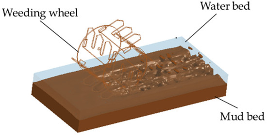 The burying weeding working mode was proposed, the weeding device with driving rake teeth was designed, and the structural parameters and working parameters were optimized to improve the comprehensive operation performance. In the actual operation process in the field, not only is the weeding device needed to effectively ensure the quality of weeding but its effect on paddy soil tillage also needs to be improved to increase the porosity of soil and effectively promote nutrient absorption in the field management period. Due to the complex working environment of paddy fields, the interaction mechanism between mechanical components, water and soil is very complex and cannot be completely determined through theoretical analysis. With the development of computer technology, virtual simulation provides a good technical method for this aspect of study. Many scholars have performed relevant simulation research on this topic. Bentaher et al. [22] simulated the interaction between plows and soil through the finite element method and explored the best plow angle. Zhang et al. [23] established a soil model by using discrete element simulation software and explored the best parameter combination of the trencher of a direct seeding machine for rape. Kotroczet al. [24] used the discrete element method to simulate the infiltration of soil through the cone permeameter and effectively evaluated the mechanical properties of the soil. Most of the above studies focus on dry land with single soil characteristics and obvious particle properties, which is not suitable for complex paddy field environments. The weeding wheel blends the water and soil [25,26]. However, the paddy field environment cannot be directly observed and analyzed through actual operation. Therefore, to simulate the soil plowing state of optimized weeding wheels, the explicit dynamics software LS-DYNA was used to establish the fluid–solid coupling model of weeding wheels and water soil. The weeding wheels were placed in a paddy field to analyze the soil disturbance and coupling stress.