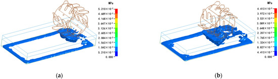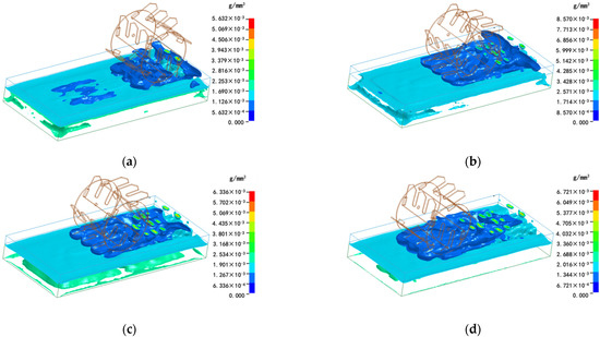 The coupling stress is the average value of the coupling stress generated on the coupling surface during the interaction between the weeding components and the water–soil model. The smaller the coupling stress is, the smaller the resistance of the component and the smaller the operation energy consumption [32]. The stress distribution at different times was measured by LS-Prepost. The stress distribution is shown in Figure 14.