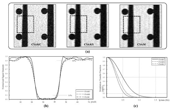 Figure 4 shows the CSAM, CSAKS, and CSAKC images, line profiles, and MTFs at the 25% undersampling ratio. Ringing and blurring artifacts were clearly seen in the CSAM images (Figure 4a). The slope of the line profile was steepest in the CSAK image, and the edge rise distances for a pixel level between 10% and 90% were 6, 7, and 3 pixels for CSAM, CSAKS, and CSAKC, respectively (Figure 4b). The 50% MTFs were 0.38 line pairs per millimeter (lp/mm), 0.43 lp/mm, and 0.54 lp/mm for CSAM, CSAKS, and CSAKC, respectively, which is 42.86% higher for CSAKC than for CSAM. The 10% MTFs were 0.59 lp/mm, 0.70 lp/mm mm, and 0.97 lp/mm, respectively, showing that CSAKC had 63.64% better inter-tissue contrast than CSAM (Figure 4c). Furthermore, despite using the same CSAK method, no artifacts were found when using CSAKC.