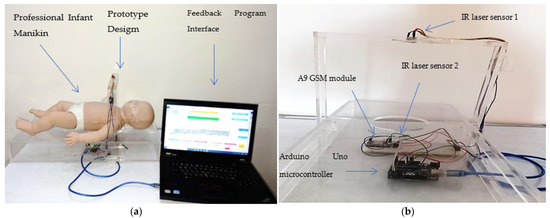 This section describes the design and development of a real-time feedback system used to improve the rescuers’ performance of infant CPR working with infant populations, the full details of the technical description available in the supplementary file. The proposed system as shown in Figure 2a,b comprises (1) a commercial infant manikin (Prestan infant manikin LLC 2020, USA) was used by the participants as the infant subject.