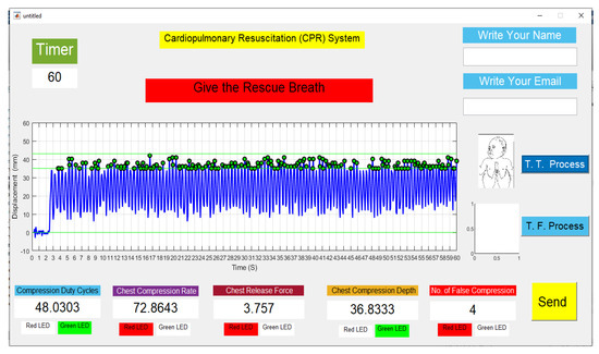 (2) The laser displacement sensor used to measure the first CPR parameter which is chest compression depth (displacement) during the compression process. (3) An Arduino Uno Microcontroller controlled the work of the displacement sensors by sending commands to the sensors to start measuring the compression depth during TT and TF compression techniques and presenting the measures on the serial monitor of the Arduino. (4) MATLAB software (R2019a) received the readings of sensors from the Arduino in real-time and summed the reading of both sensors to calculate the actual compression depth. The other CPR quality parameters, compression release force, compression rate and compression duty cycle, achieved in the compression stage were calculated using the MATLAB software. (5) The performance feedback was provided by real-time program implemented using MATLAB software to both monitor and assist participants while performing CPR on the simulated infant training manikin. The CPR parameters were presented using a custom graphical user interface (GUI), see Figure 3. Applying the social distance condition imposed by the SARS-CoV-2 pandemic that made it difficult to gather all the participant in the CPR training center. Thus, a GSM chip (A9 module) controlled by the Arduino microcontroller was used to send the training results to the CPR training center to provide each participant with CPR certificate. The GUI of the proposed system contained a send option used for sending the achieved CPR performance result to CPR training center. The achieved CPR quality measures were sent from the MATLAB program to the Arduino microcontroller through a USB cable to a GSM module which transferred the data to the CPR training center, see Figure 4. The measured data from each group were presented as mean ± SD and median value. The statistical significance of the differences between the groups was determined by two tails, paired samples of student’s test (T test). The significance level for all analyses was set as p-value < 0.05.