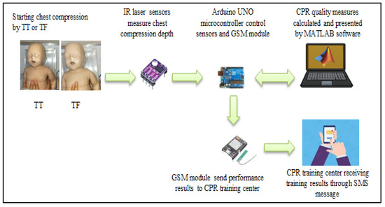 The principal contributions of the proposed system are listed as follows: (1) Establishing background knowledge as necessary to be able to evaluate the effects of the real-time feedback system on CPR quality. (2) Propose a real-time interaction system based on an IR sensor to monitor and extract the CPR parameters and improve CPR performance in any environmental settings. (3) Propose developing a real-time feedback system to monitor and improve infant CPR performance for both medical staff and laypersons. (4) Analyze infant CPR performance with no-feedback and with a real-time feedback system and evaluate the CPR parameters delivered within the recommended target line as the main consideration. (5) Analysis of CPR performance based on the effect of using the TF and TT compression techniques and appraise the appropriate and achievable mechanism applied in infant populations for delivering high-quality infant CPR.