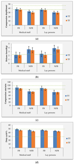 Mean value of the four CPR parameters achieved during no feedback and feedback CPR performance using TT and TF compression technique (a) the chest compression depth parameter; (b) the chest release force parameter; (c) the chest compression rate parameter; (d) the compression duty cycle parameter; and the dashed line represents the guideline range of each CPR parameter.