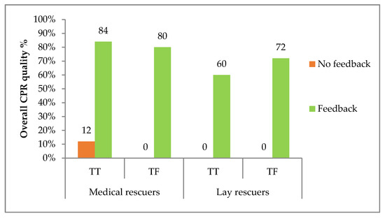 To assess overall CPR quality during infant CPR, the proportion of rescuers that simultaneously achieved the recommended targets of all CPR parameters was calculated for each group, medical rescuers and lay rescuers during no feedback and feedback CPR using the TT and TF chest compression techniques. The overall CPR quality achieved by both medical rescuers and layperson groups with feedback and without feedback from CPR using TT and TF compression techniques is shown in Figure 6.