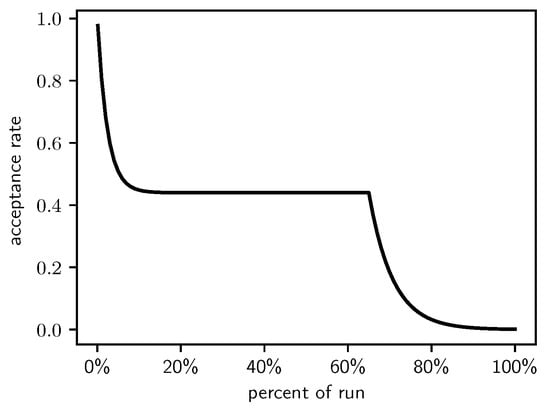 This leads to exponentially declining acceptance rates for the first 15% and the final 35% of the run, and a constant acceptance rate of 0.44 for the other 50% of the run. This Lam target acceptance rate is shown in Figure 1.