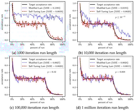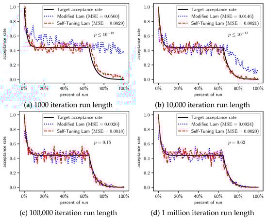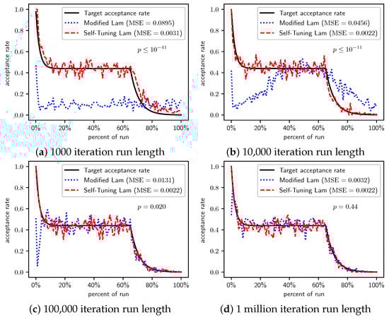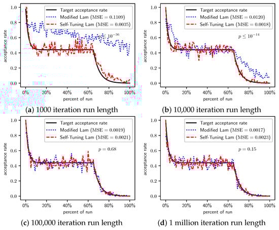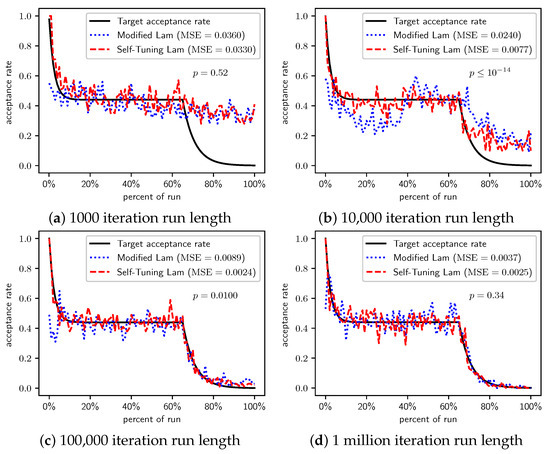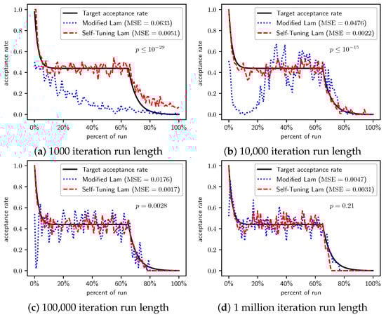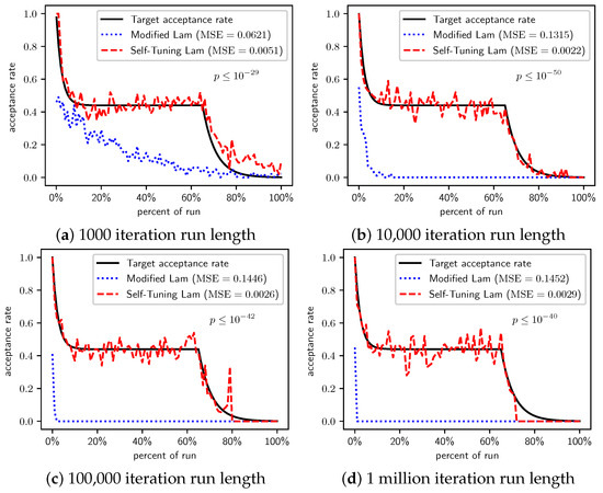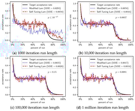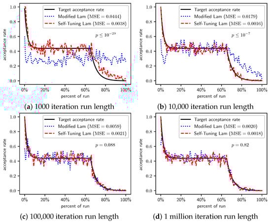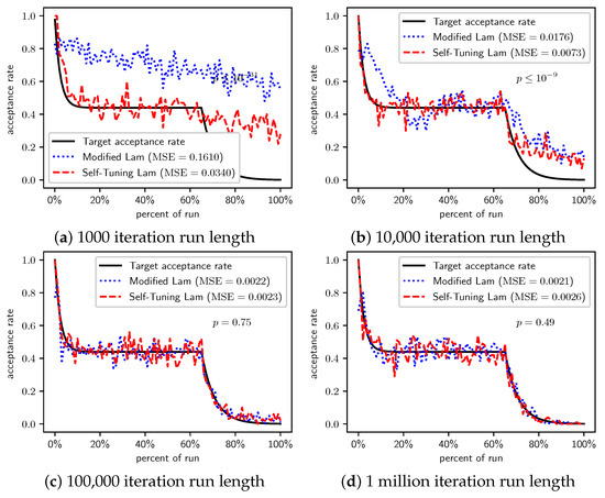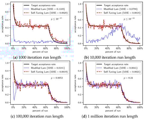 In Section 2.1, we saw that the Modified Lam must approximate the acceptance rate as it changes throughout the run. Recall that is the estimate of the acceptance rate at iteration i. The Modified Lam has three constants associated with the definition of , including the and in Equation (2), as well as the value of . Our Self-Tuning Lam introduces hyperparameters for these.