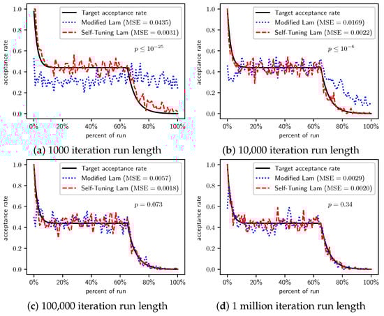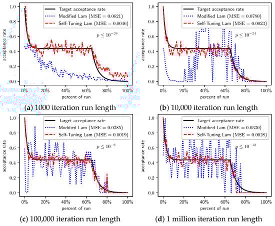 Figure 17, Figure 18, Figure 19 and Figure 20 show graphs of the acceptance rates of the Self-Tuning Lam and the Modified Lam, relative to the target Lam acceptance rate for the problems of minimizing , , , and , respectively. Just as we saw previously with the problems of minimizing and , the Self-Tuning Lam more consistently follows its target Lam acceptance rate, independent of function scale, as seen in each of Figure 17, Figure 18, Figure 19 and Figure 20, and independent of run length as seen in parts (a) to (d) of each of the four figures that follow. This is contrasted with the acceptance rates of the Modified Lam that only converge to the target acceptance rates for the longer run lengths, such as in part (d) of each of the following figures, and in some cases part (c).