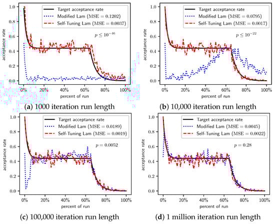 In our experiments, we showed that due to this, the Modified Lam is sensitive to cost function scale and run length. Namely, we saw that short runs of the Modified Lam lead to an acceptance rate during the run that rarely matches the target acceptance rate, and is often significantly below the target, such as seen in Figure 2a, Figure 3a, Figure 4a, Figure 5a, Figure 6a, Figure 9a, Figure 10a, Figure 11a, Figure 13a, Figure 14a, Figure 15a, Figure 18a, Figure 19a and Figure 20a. For longer runs, the Modified Lam is often slow to match the target acceptance rate, and then once it does begins large oscillations around the target as it continuously overcompensates in its adjustments, such as in Figure 3b, Figure 5b–d and Figure 6b. In some cases, the Modified Lam is just generally far off from its target acceptance rate, such as in Figure 4a–d, Figure 10b, Figure 11b, Figure 12a, Figure 14b, Figure 15b, Figure 17a, Figure 19b and Figure 20b.