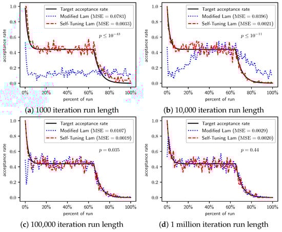 We solve each problem 100 times with the Self-Tuning Lam and 100 times with the Modified Lam, for each of several run lengths. At 200 equally spaced intervals during the run, we record whether or not SA accepted the neighbor. Then, at each of those 200 intervals, we compute the acceptance rate across the 100 SA runs as the percentage of the runs where SA accepted a neighbor at an interval. We then compute the Mean Squared Error (MSE) of the 200 samples of the Self-Tuning Lam’s acceptance rate relative to the target rate, and likewise for the Modified Lam. After confirming normality, we test the significance of the difference in the MSE with a T-test.