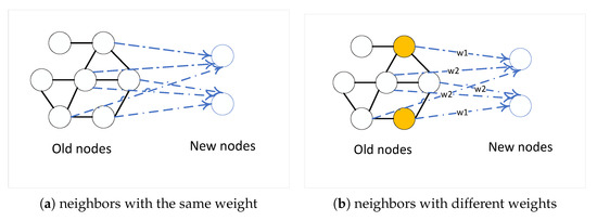 For each new node , a neighbor set of fixed size m is sampled to obtain a matrix . The representation of each new node is shown in Equation (9), and the representation of the new node is obtained through the aggregation of neighbor nodes’ information.