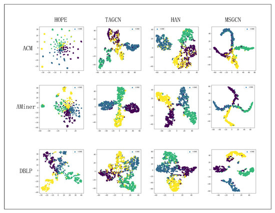 In order to better reflect the superiority of our model in the node classification task, for each category we select one with the best experimental result along with our MSGCN model, to show the visualization results. Here we choose HOPE for the classic graph embedding methods, TAGCN for homogeneous GNN methods, and HAN for heterogeneous graph methods. The experimental results are shown in Figure 4. We can find that these models can achieve good results in node classification. However, many nodes in comparison models are ambiguous, so it is not clear which cluster these nodes should belong to. In contrast, although the MSGCN model cannot classify all the nodes correctly, it can get a more obvious result with higher accuracy.