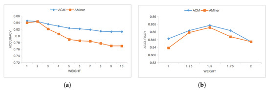 (a) Weight range from 1 to 10. (b) Weight range from 1 to 2. The experimental result of the inductive learning task. It reflects the influence of assigning different weights to important nodes on the accuracy in the node classification task of new nodes.