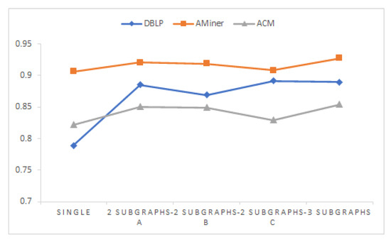 It can be seen from the figure that, for the three datasets, the three-sub-graph has the best experimental effect, while the single-graph has the worst effect. Therefore, we can conclude that our method can be used on heterogeneous graphs with multiple types of nodes and edges.