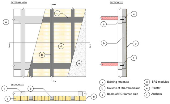 The proposed RC-framed skin is externally applied to the existing RC building described in the previous section and connected at each floor-level using anchor rods designed to guarantee a properly rigid connection as well as the respect of the hierarchy of strength principle. EPS modules 1200 mm wide and 325 mm thick are used to clad the structure. The adopted cross-sections for the RC-framed skin are 250 mm × 250 mm for the columns and 250 mm × 400 mm for the beams, respectively.