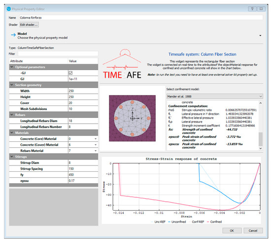 Concerning the implementation phase, for the columns of the reinforcing RC-framed skin, an ad-hoc GUI (Graphical User Interface) for STKO [15] has been specifically developed providing a utility for users to input easily the geometric and material characteristics and computing automatically the effect of confinement on core material. In particular, the plugin recognizes the class of constitutive model adopted for cover concrete in OpenSees (e.g., Concrete01, Concrete02, Concrete04, etc.) and computes the effect of confinement according to several formulations, including the one developed by Mander et al. [17], adopted in this work as recommended in EN1998-3 [2] and Italian National Standard [20]. Finally, the plugin creates on the fly (when the model runs) a new material for core concrete (confined) of the same class of the unconfined concrete. Of course, the user always has the possibility to specify a customized confined material law when he does not want to use the plugin automatism. The window of the GUI for the reinforcing column of the RC-framed skin is shown in Figure 2, where both the constitutive laws adopted in this work for confined and unconfined concrete are depicted in terms of stress-strain curve.