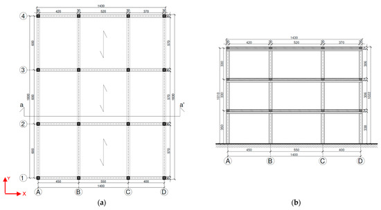 Three-story RC building: (a) Plan; (b) transversal view (units in cm).